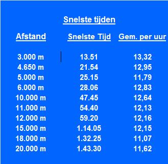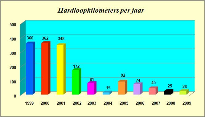 Het totaal van de van 1999 t/m 2009 gelopen kilometers is: 1.600 km